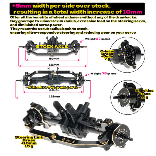 RampCrab Axle widening Upgrade Parts for TRX4M, 5mm Wider on Each Side (Front & Rear), Brass Upgrades Parts for TRX4m RC Crawler Car, Fit for 1/18 TRX4-M Unlimited Trail Buggy, Ultra 5